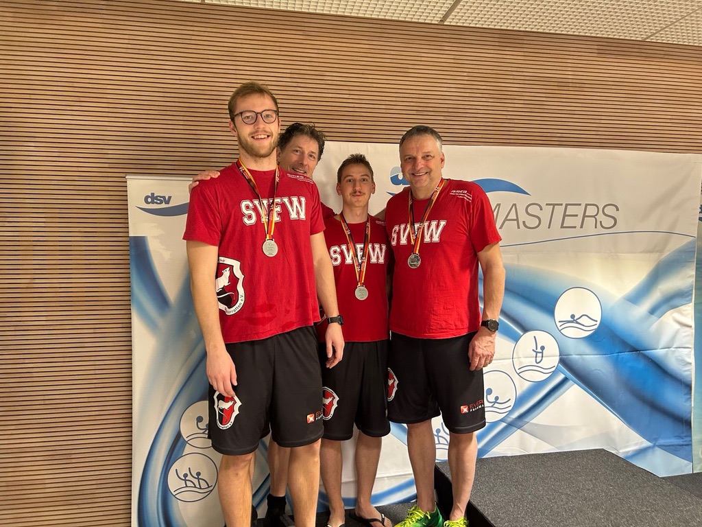 Allen voran die Herrenstaffel der Altersklasse 160+: Über 4×200 Meter Freistil schwammen die Wasserratten zu einem starken zweiten Platz und sicherten sich damit den Titel des Deutschen Vizemeisters.