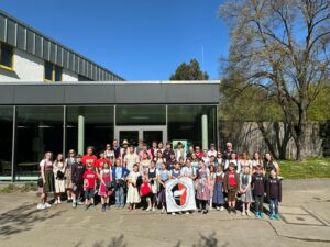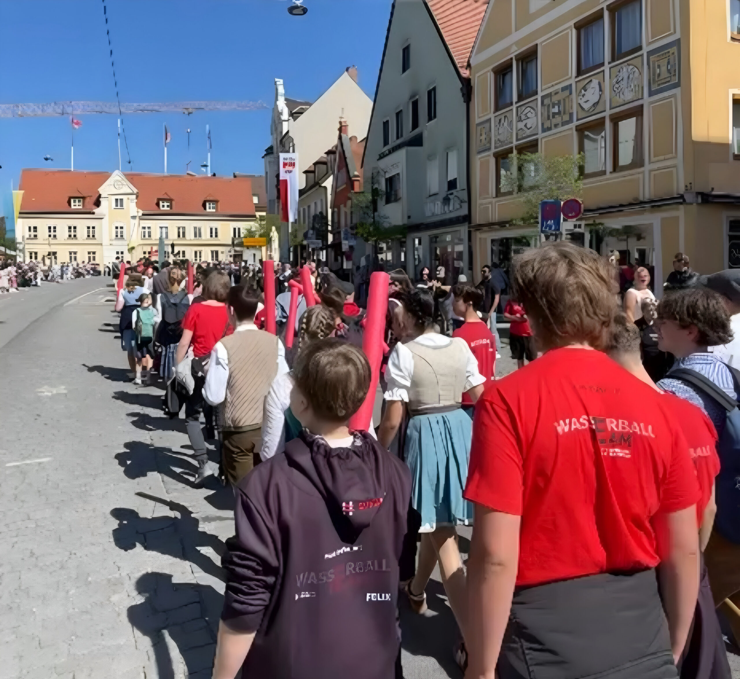 Am Samstag, den 25. April, machte sich eine rund 60-köpfige Gruppe aus Sportlerinnen und Sportlern, Eltern und Vereinsmitgliedern auf den Weg. Ausgestattet mit roten Schwimmnudeln und teilweise in Tracht ging es gemeinsam über die Hauptstraße in Richtung Festplatz – ein buntes Bild, das vor allem bei den jüngeren Teilnehmern für große Begeisterung sorgte.